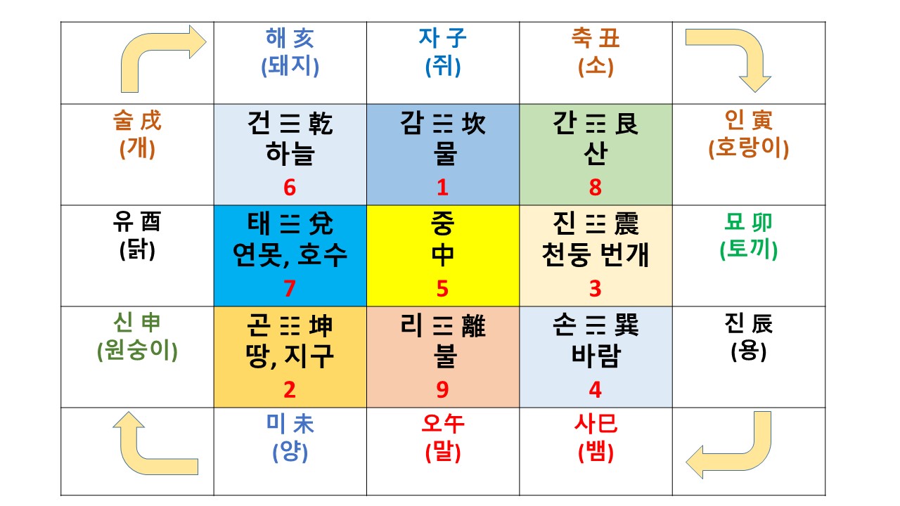 세상은 음양오행과, 12가지의 지지, 9가지의 감,곤, 진, 손,중,건,태, 산,리 의 순으로 순화한다고 보며,